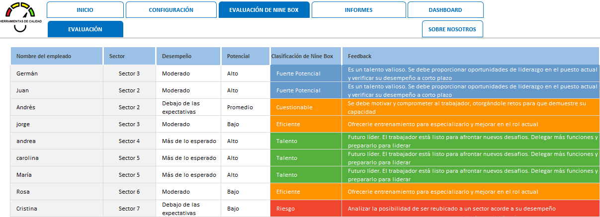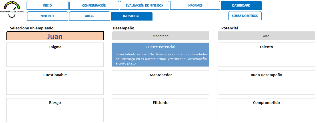 Su objetivo principal es apoyar la toma de decisiones en materia de desarrollo, capacitación, planes de sucesión y gestión del desempeño, facilitando la identificación de colaboradores de alto potencial, talento clave a retener, necesidades de mejora y posibles riesgos de desempeño. Asimismo, contribuye a alinear la estrategia de recursos humanos con los objetivos organizacionales, promoviendo una gestión más objetiva y sistemática del capital humano.